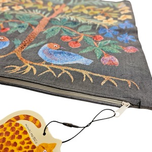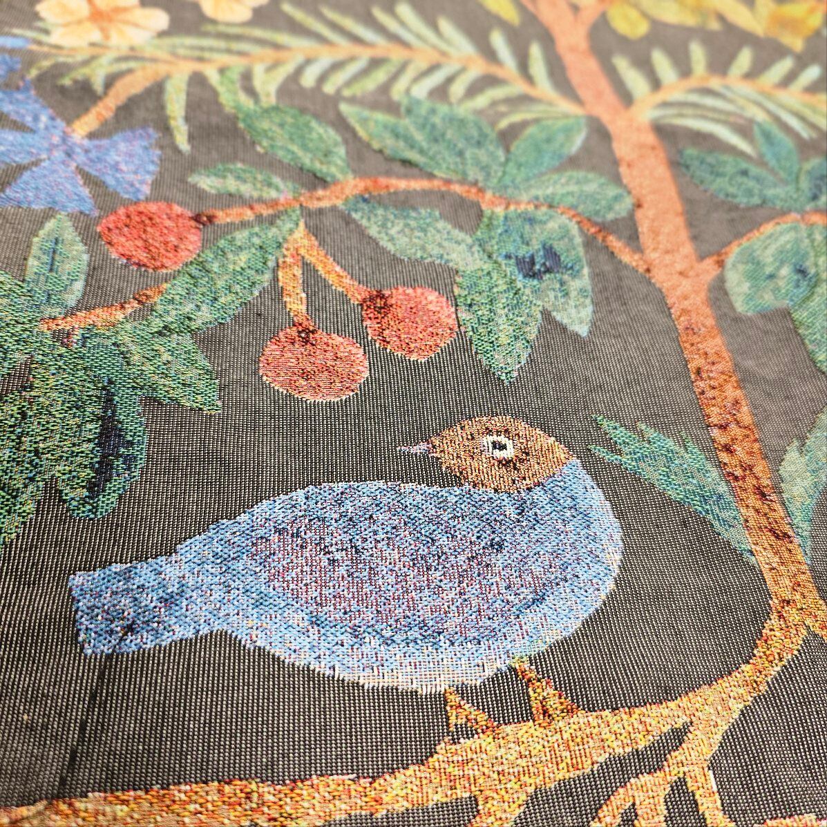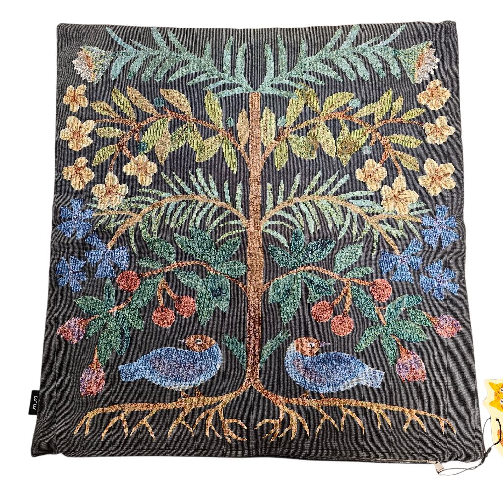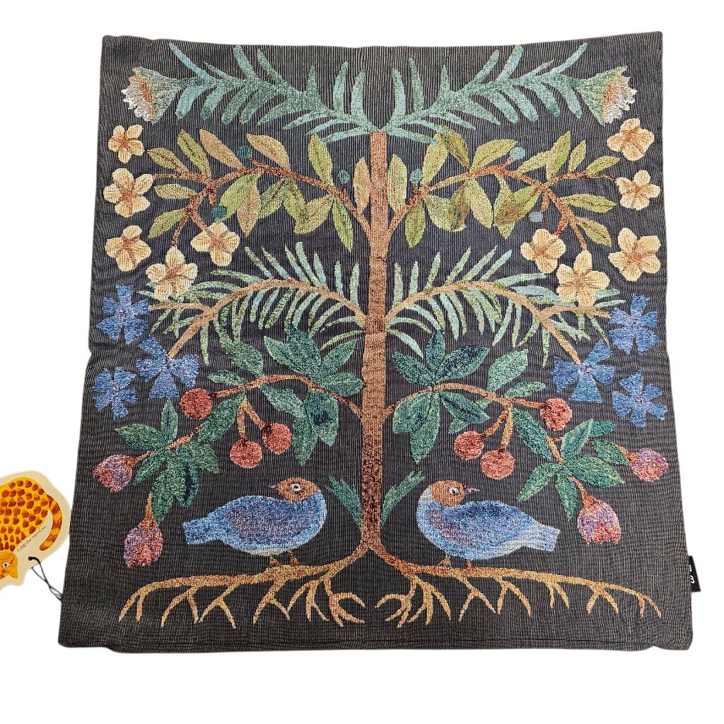 クラシカルな風合いが魅力のゴブラン織りに、松尾ミユキさんらしい、植物と動物の切り絵モチーフが映えるクッションカバーです。