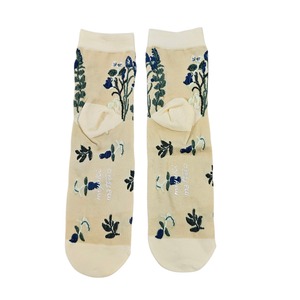 やさしいタッチの植物のイラストが、編み柄でふんわりと浮かび上がる靴下です。